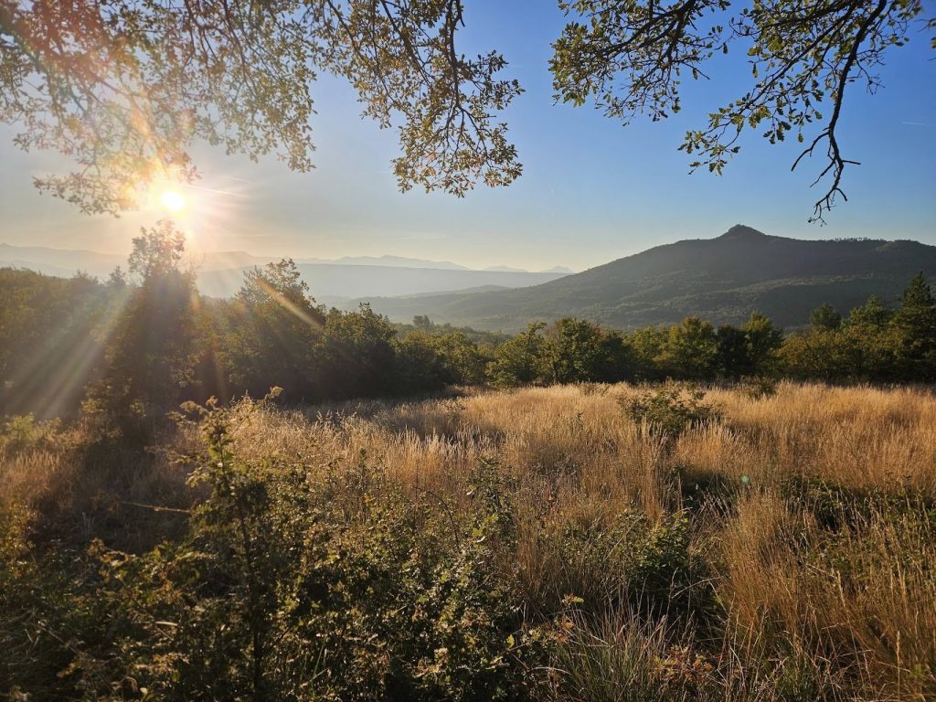 Samedi matin, notre petit groupe de 9 courageux démarre « à la fraîche » (déjà 28°C quand même !) vers le col de Saint Jurs en direction du lac de Majastres, par diverses pistes caillouteuses et jolis sentiers ombragés. Au cours de la matinée nous croisons plusieurs 4X4, et lorsque nous arrivons à notre pause pique nique où les chevaux peuvent se désaltérer, nous constatons que le rallye de 4×4 en a fait son point de relais, ce qui a pas mal perturbé la quiétude du lieu. Par contre, les organisateurs nous ont gentiment proposé de déguster sauterelles, grillons, et autres vers de farine, qui permettaient de faire gagner des points aux participants du rallye… Beurk ! Après le déjeuner, nous voilà repartis en direction du col des Abbesses où nous avons fait une pause photo. Puis nous sommes redescendus vers Saint Jurs, profitant d’un panorama magnifique sur le plateau de Valensole et ses champs de lavande. Sur le chemin du retour, nous nous sommes désaltérés dans la fontaine fraiche et salvatrice de Saint-Jurs, avant de rentrer au camping de la Vauvenières nous rafraichir sous la douche, et de déguster de délicieuses pizzas accompagnées de sympathiques bières locales. Dodo en bivouac.