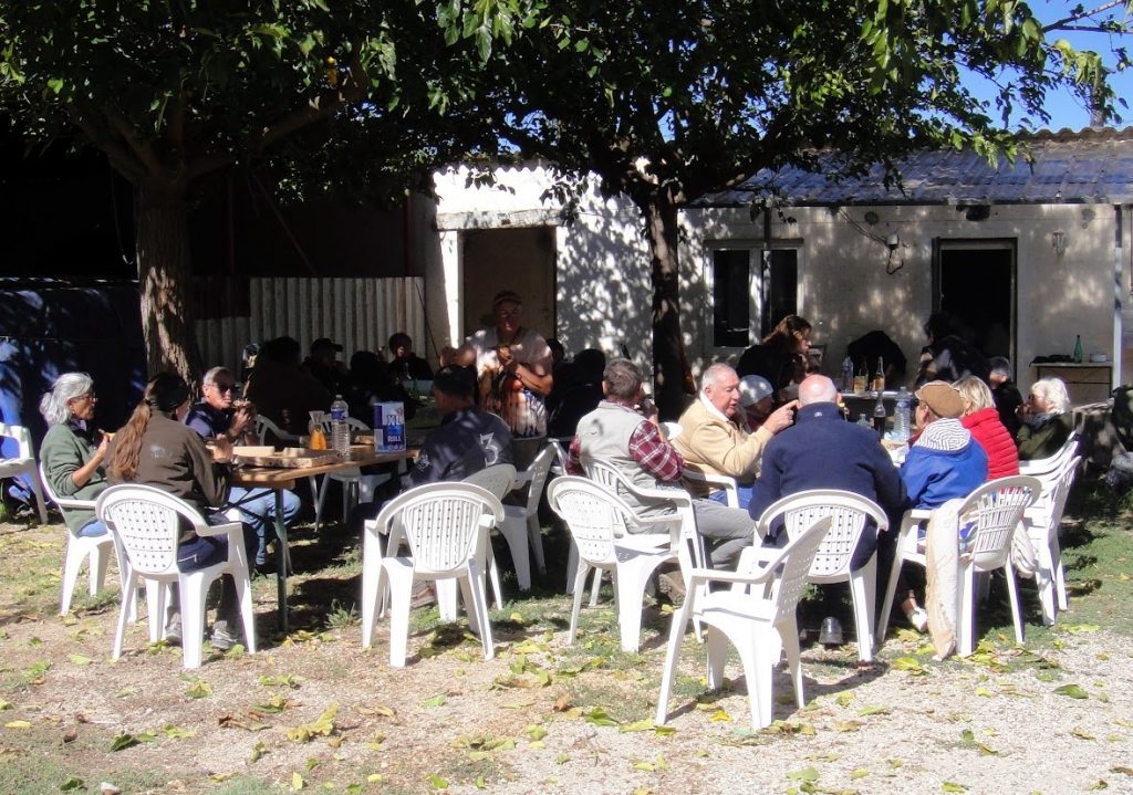 La pluie s’invite mais pour l’instant, nous n’en avons cure, bien à l’abri sous le grand barnum monté quelques jours avant par Marc, Christian et Pétou : bravo pour leur prévoyance et leur équipement performant ! Nous prenons donc le temps de l’apéritif autour de pizzas réchauffées sur la plancha et des (beaux) restes de l’excellente anchoïade de Marc de la veille. Puis nous apprécions les saucisses et merguez grillés avec attention par notre cuistot Robert. Il pleut de plus en plus et nos varois, Jean-Yves et Sylvie, Catherine et Mari-Lou, qui ont de la route à faire pour rentrer, décident d’aller récupérer leur van grâce à Christian, notre intendant à toute épreuve. Le moment de la tarte aux pommes/chantilly est celui des grandes hésitations pour le reste de la troupe car à présent il pleut davantage : on se remet en selle ou on va chercher les vans ? Jean-Yves propose alors de ramener avec son van tous les chauffeurs et tout le monde accepte sauf un, le plus courageux d’entre nous, Lucien, qui décide de faire le retour à cheval. Finalement, c’est lui qui a eu raison car la pluie cesse. Après de grandes embrassades, nous nous quittons heureux de cette chouette randonnée dans ce coin du Luberon méconnu et de ce nouveau gîte tout neuf, confortable et accueillant.