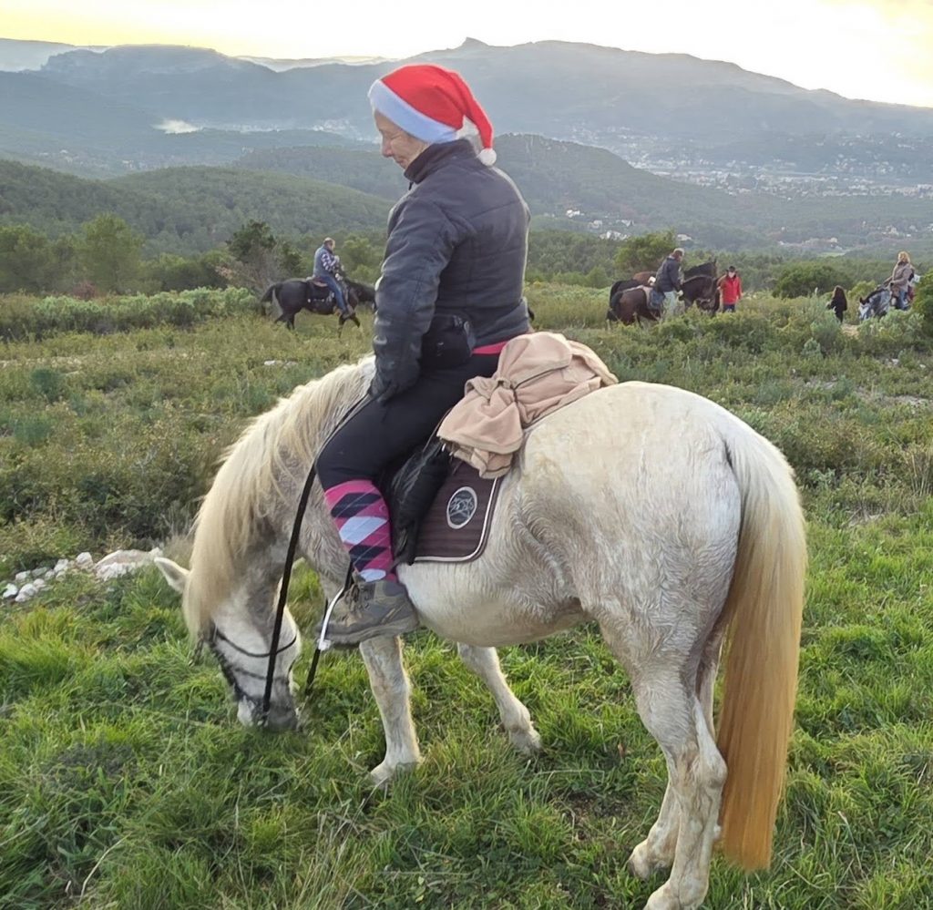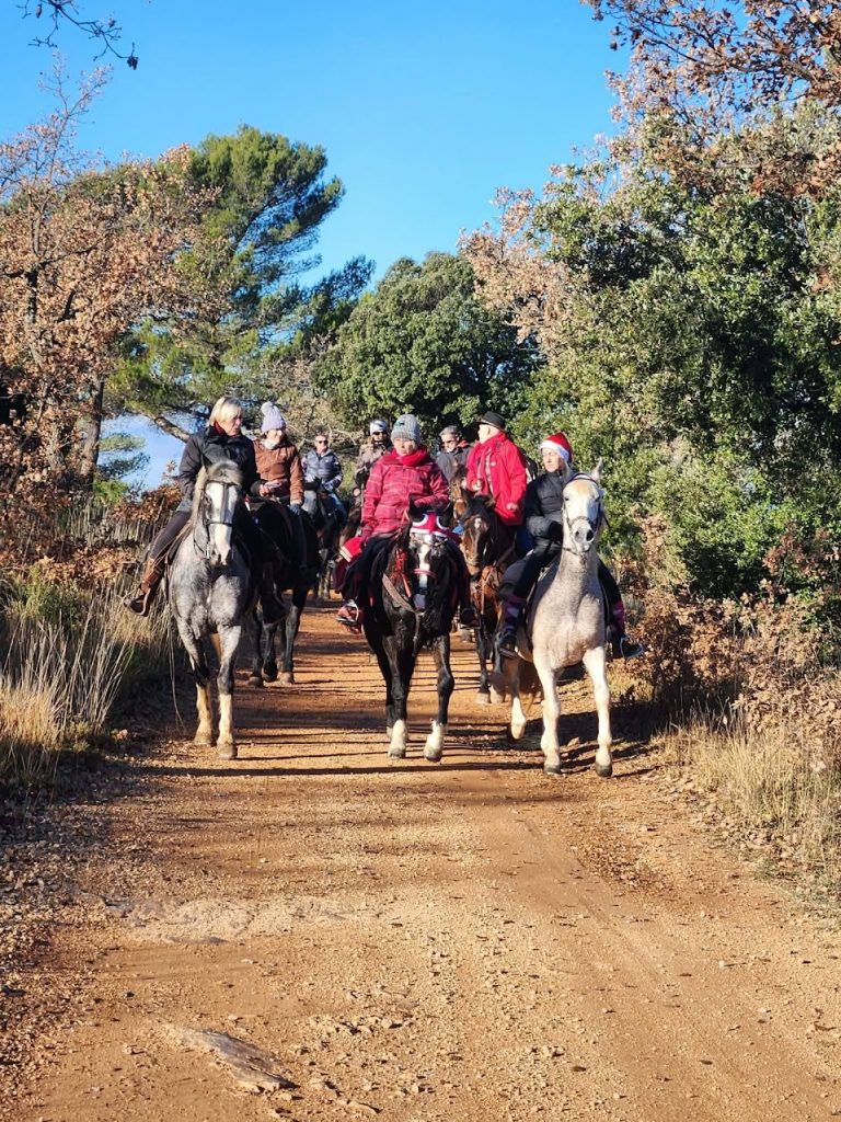 Nous voilà réunis chez Gérard, pour les plus courageux, afin de clôturer cette année avec la traditionnelle sortie chez notre ami Cobalto à Peynier. Le temps de seller nos montures, nous partageons café chaud et quelques douceurs préparées par M.Thé. Nous partons sagement en file indienne, le temps de récupérer au passage l’attelage de notre ami Marco et Laurence élégamment décoré aux couleurs de Noel en dominance rouge. Quelques cavaliers se joignent à nous en partant également de chez Marco. C’est avec l’esprit joyeux et les sabots qui martèlent le sol que nous arpentons les sentiers que je connais si bien.