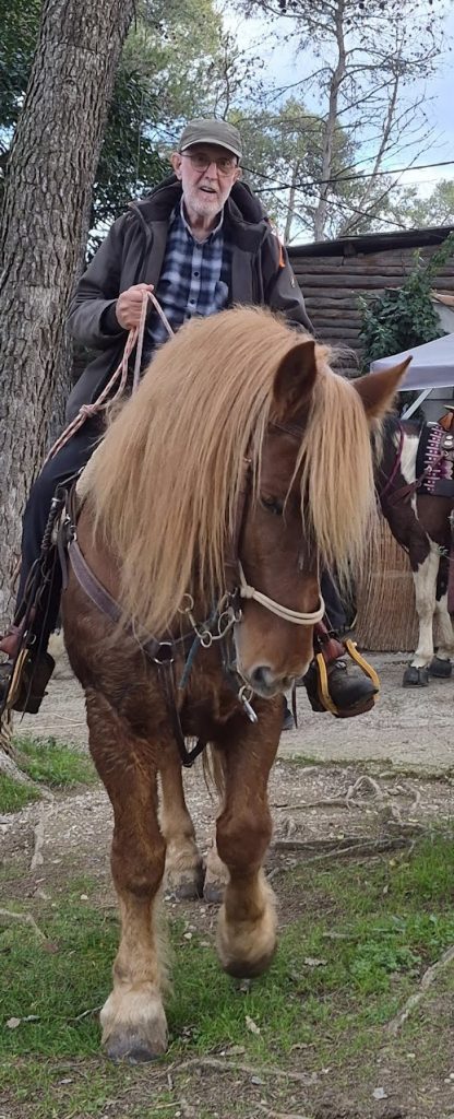 Mais l’heure du retour approche et la nuit tombant très vite, il est grand temps de repartir. Les derniers au revoir aux amis et la colonne reprend les sentiers du retour. La calèche de Marco se fondant très bien parmi les cavaliers, c’est une belle file qui envahi le paysage de mes chères collines.