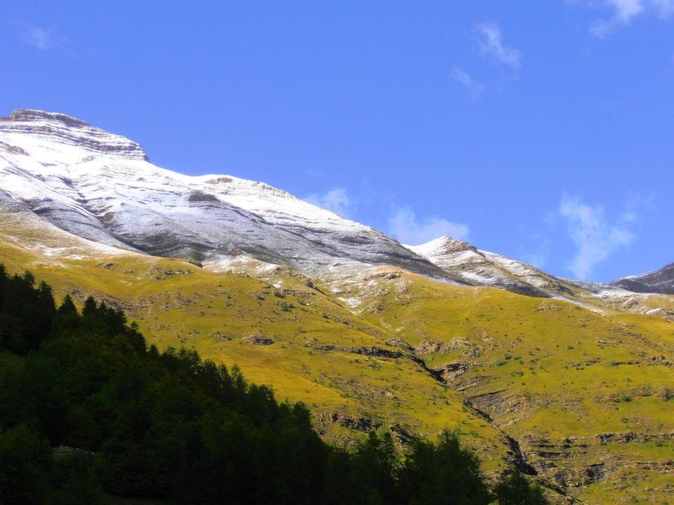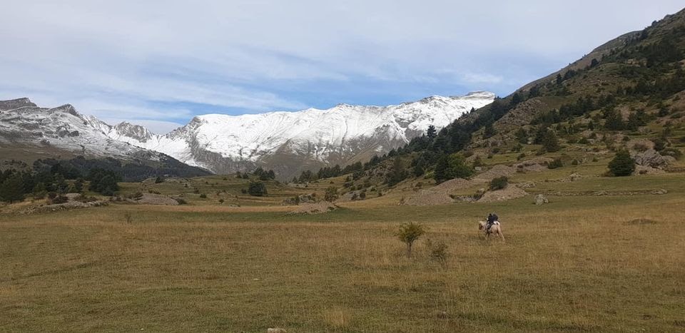 Malgré la fraîcheur et l’humidité de la nuit, le matin est radieux : un beau soleil et un ciel bleu découpé par les montagnes, les oiseaux chantent, les moutons du champs voisin bêlent… la vie est là calme et tranquille. Nous partons bon train, tout va bien pour nos montures : bon sol, température idéale et pas de mouche !