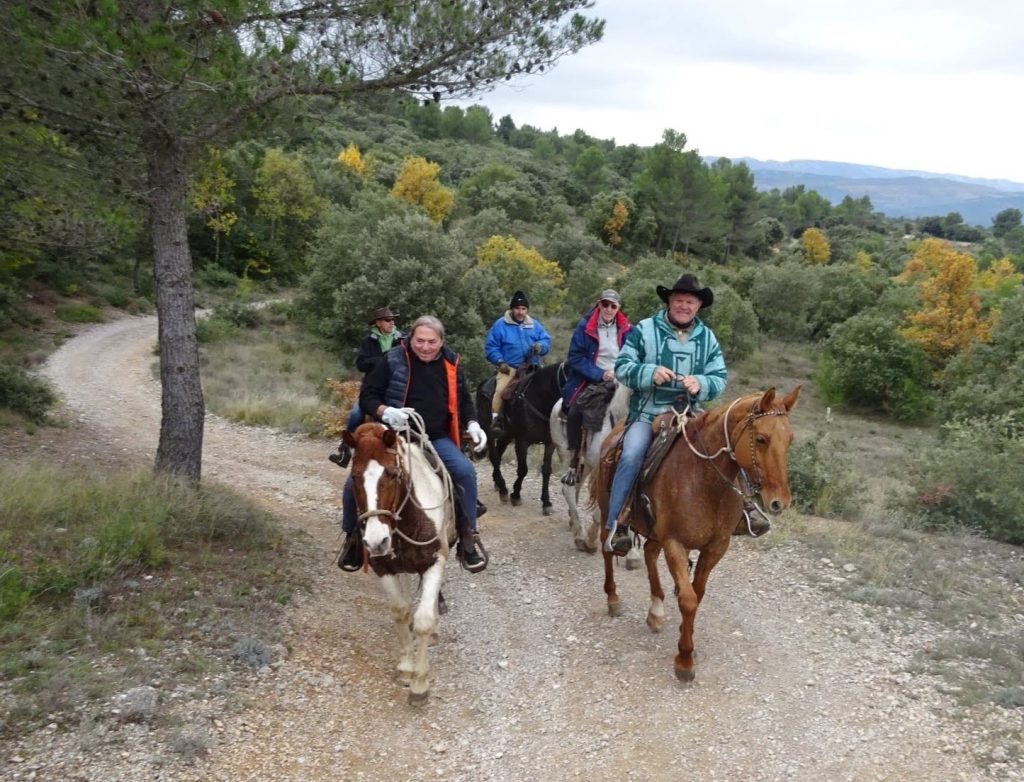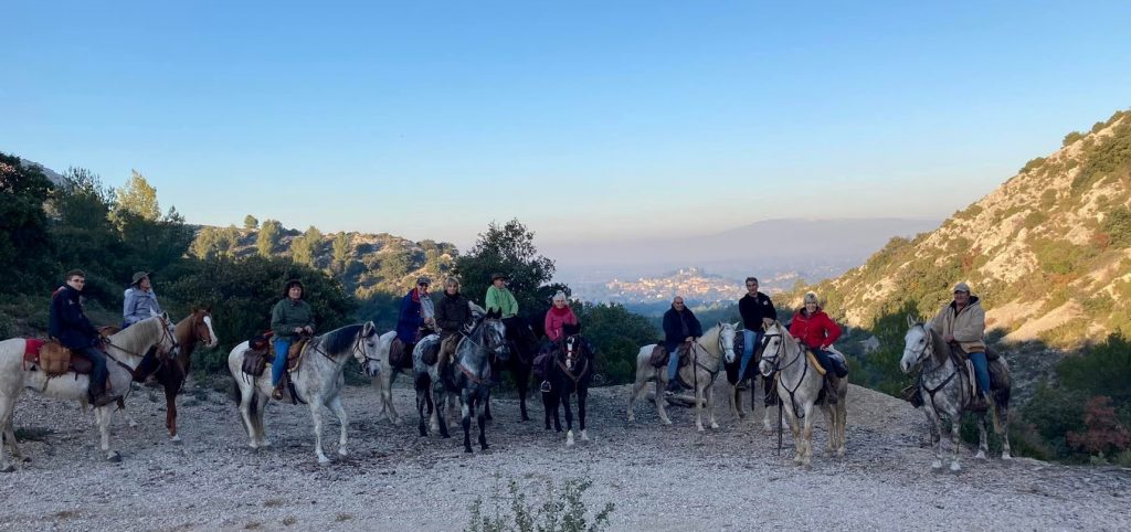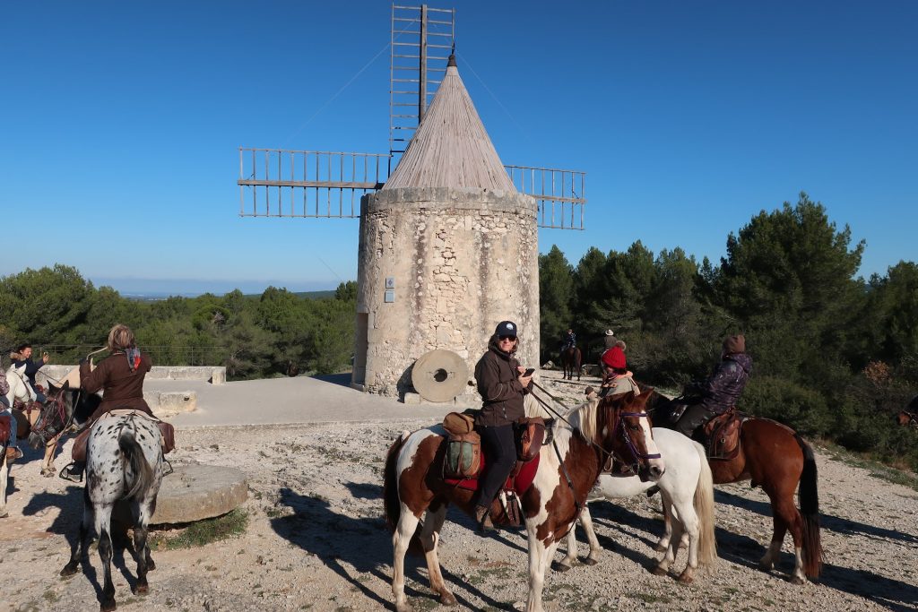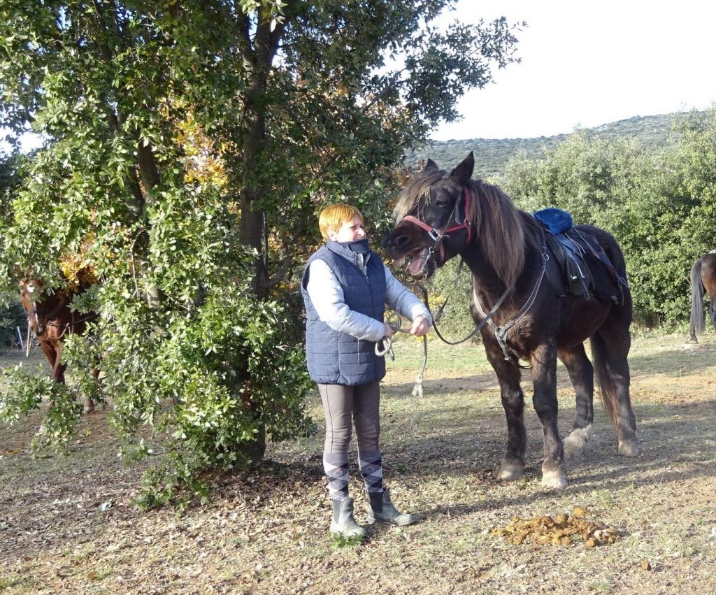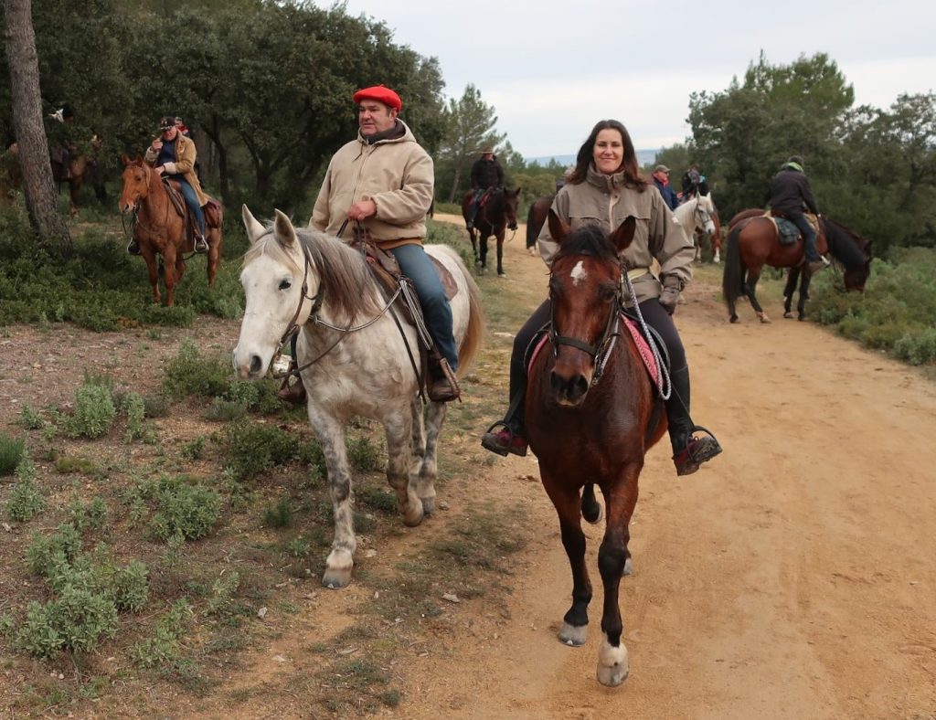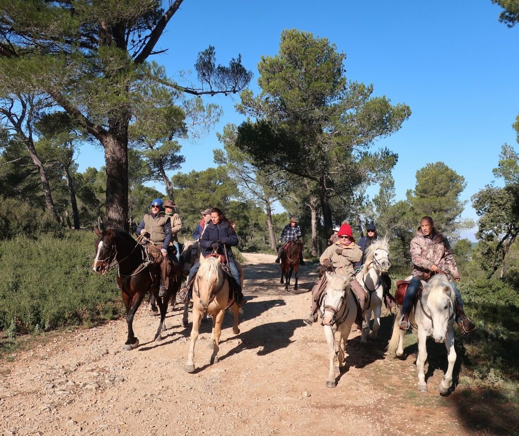 Place à la randonnée. Pas le temps de tergiverser. En arrivant les derniers, le temps de préparer les chevaux et de monter en selle nous rejoignons l’équipée fantastique. Nous n’avions pas fait attention, mais il y a du monde, plus d’une vingtaine de cavalières et cavaliers. Ca nous change de nos ballades à deux. Nous montons direction la Sainte Baume par une piste. L’air est frais, la plupart des cavaliers sont encapuchonnés. Nous faisons un peu plus connaissance avec certains en queue de peloton. Arrivés sur un plateau, nous avons une vue plongeante sur Cuges. La randonnée est une succession de pistes. Sur la fin du parcours avant le déjeuner, un petit bout de route dans la commune de Riboux pour rejoindre le bistrot de RIBOUX. On nous enseigne la technique pour que les chevaux se reposent. Les attacher suffisamment haut pour les empêcher de brouter. Merci Florence et Georges. Le moment du déjeuner est le bienvenu pour nos novices arrière-trains. Quelle organisation ! Il y a une liste de tous les participants, avec pour chacun les entrées, plats et desserts pré réservés. C’est copieux et c’est bon. Le moment du repas nous permet de faire un peu plus connaissance avec quelques cavaliers et entre autres, l’histoire du petit chat Malo qui stoppe les chevaux sur la route ! Un café et hop ! Pas le temps de faire la sieste qu’il faut vite repartir.
