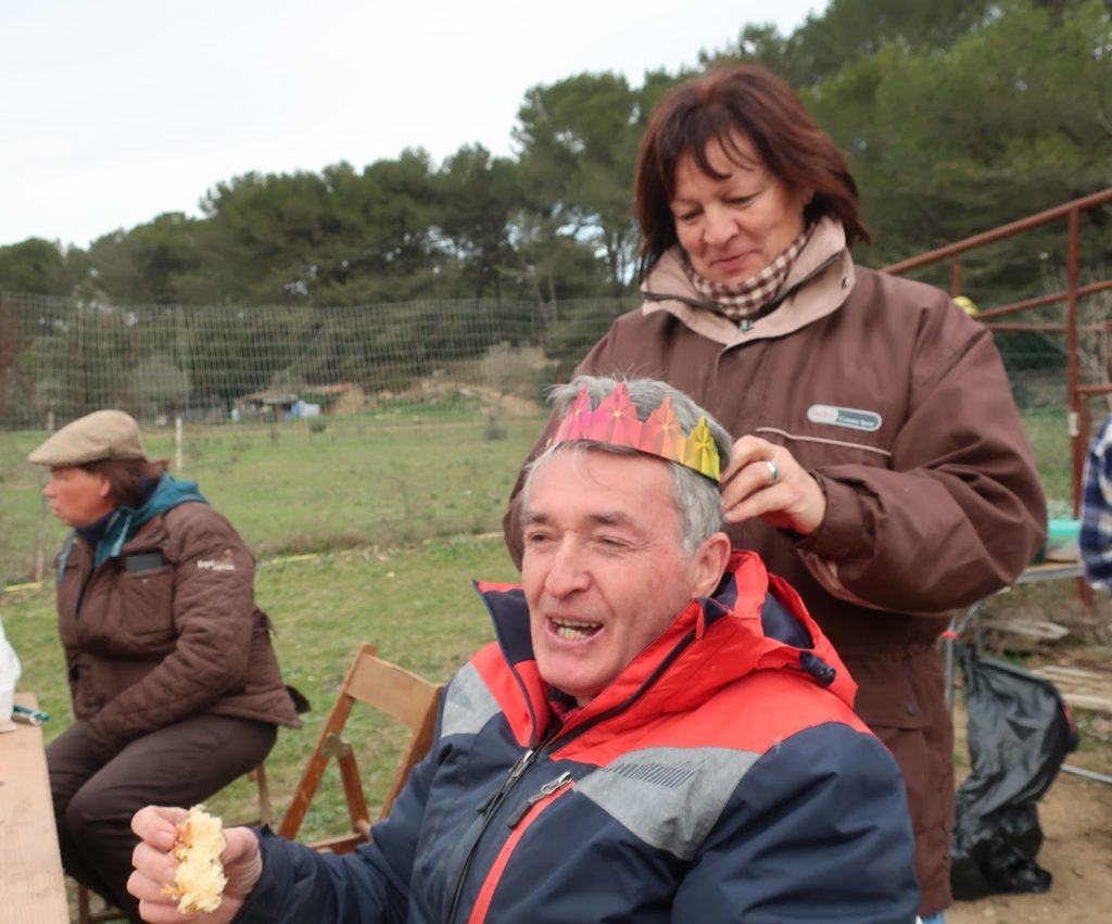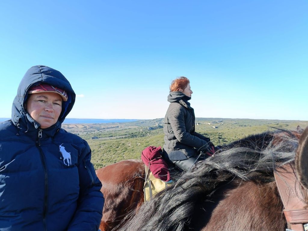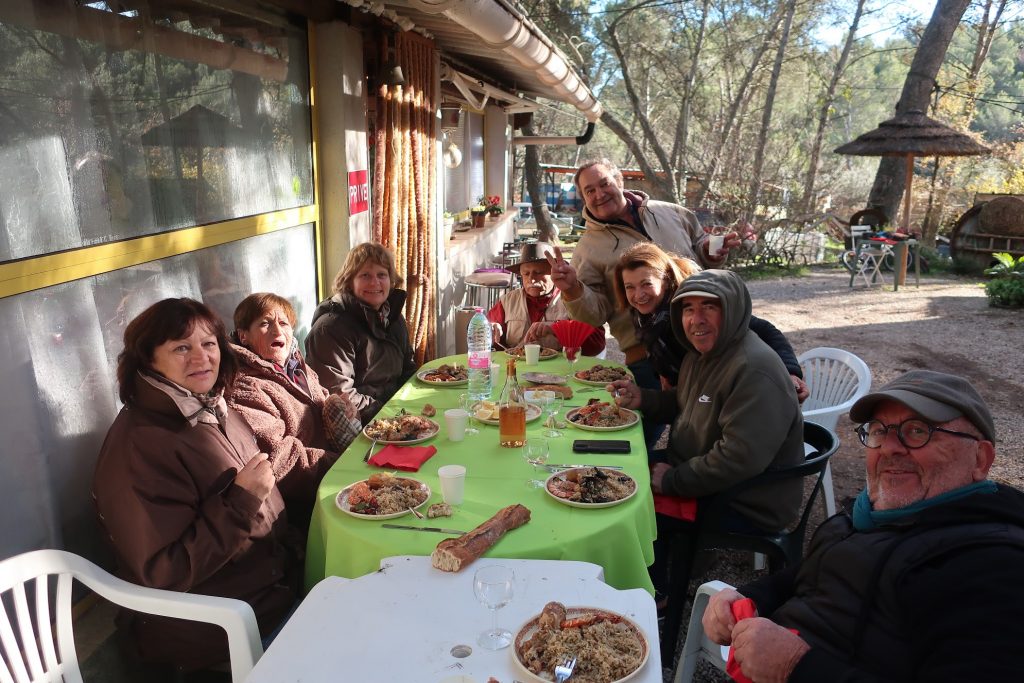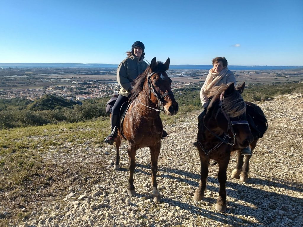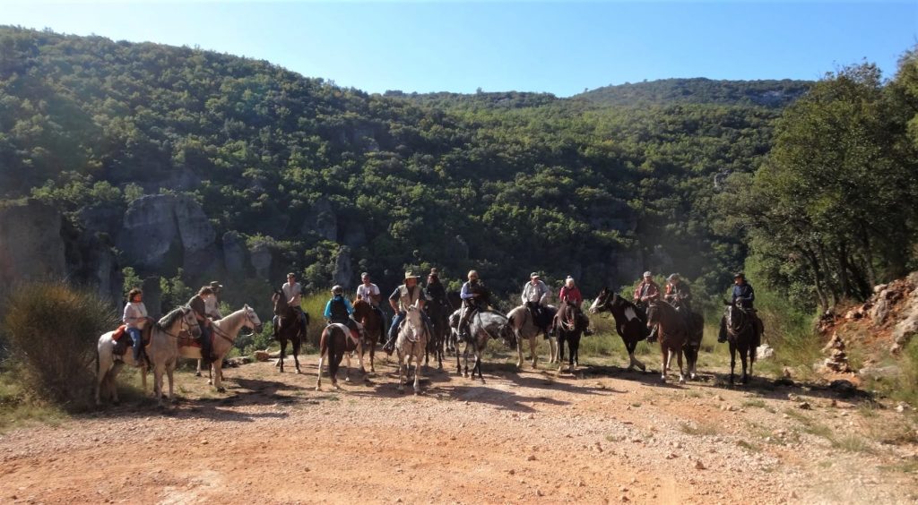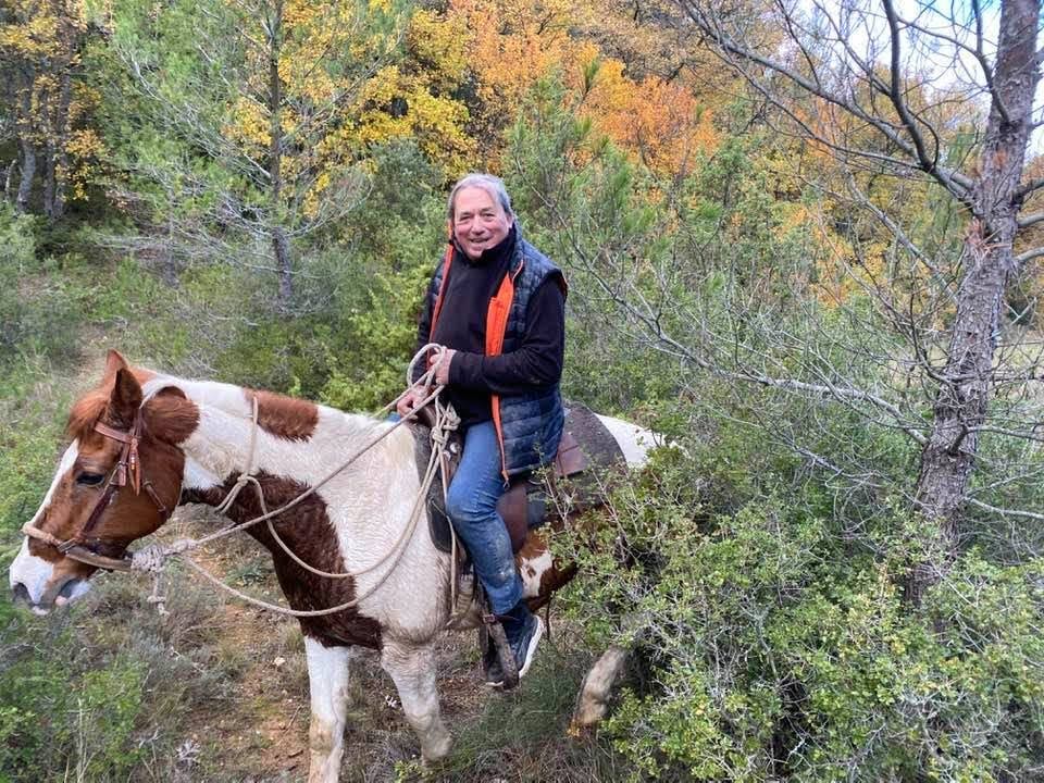 Place à la randonnée. Pas le temps de tergiverser. En arrivant les derniers, le temps de préparer les chevaux et de monter en selle nous rejoignons l’équipée fantastique. Nous n’avions pas fait attention, mais il y a du monde, plus d’une vingtaine de cavalières et cavaliers. Ca nous change de nos ballades à deux. Nous montons direction la Sainte Baume par une piste. L’air est frais, la plupart des cavaliers sont encapuchonnés. Nous faisons un peu plus connaissance avec certains en queue de peloton. Arrivés sur un plateau, nous avons une vue plongeante sur Cuges. La randonnée est une succession de pistes. Sur la fin du parcours avant le déjeuner, un petit bout de route dans la commune de Riboux pour rejoindre le bistrot de RIBOUX. On nous enseigne la technique pour que les chevaux se reposent. Les attacher suffisamment haut pour les empêcher de brouter. Merci Florence et Georges. Le moment du déjeuner est le bienvenu pour nos novices arrière-trains. Quelle organisation ! Il y a une liste de tous les participants, avec pour chacun les entrées, plats et desserts pré réservés. C’est copieux et c’est bon. Le moment du repas nous permet de faire un peu plus connaissance avec quelques cavaliers et entre autres, l’histoire du petit chat Malo qui stoppe les chevaux sur la route ! Un café et hop ! Pas le temps de faire la sieste qu’il faut vite repartir.