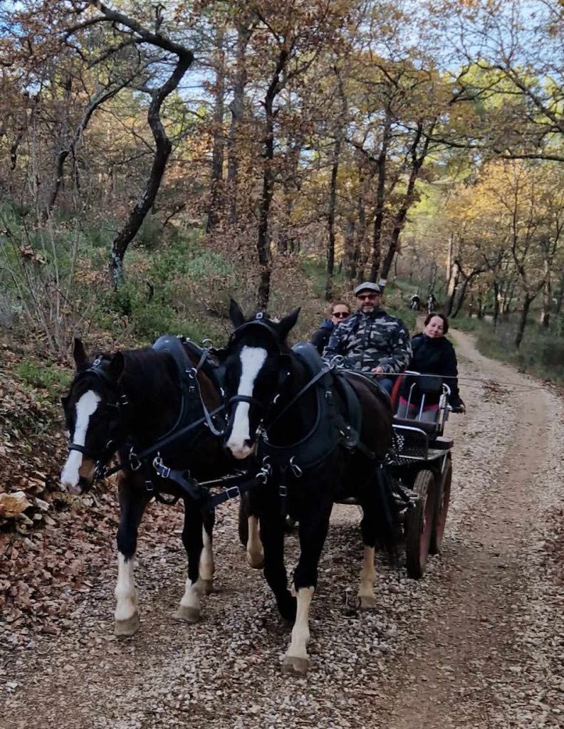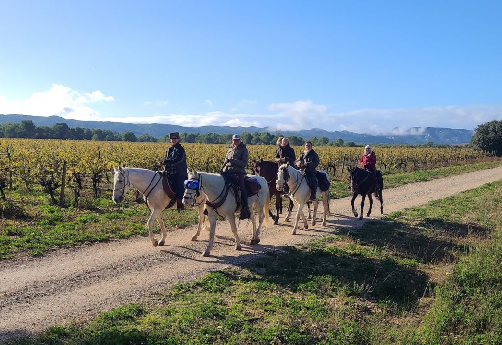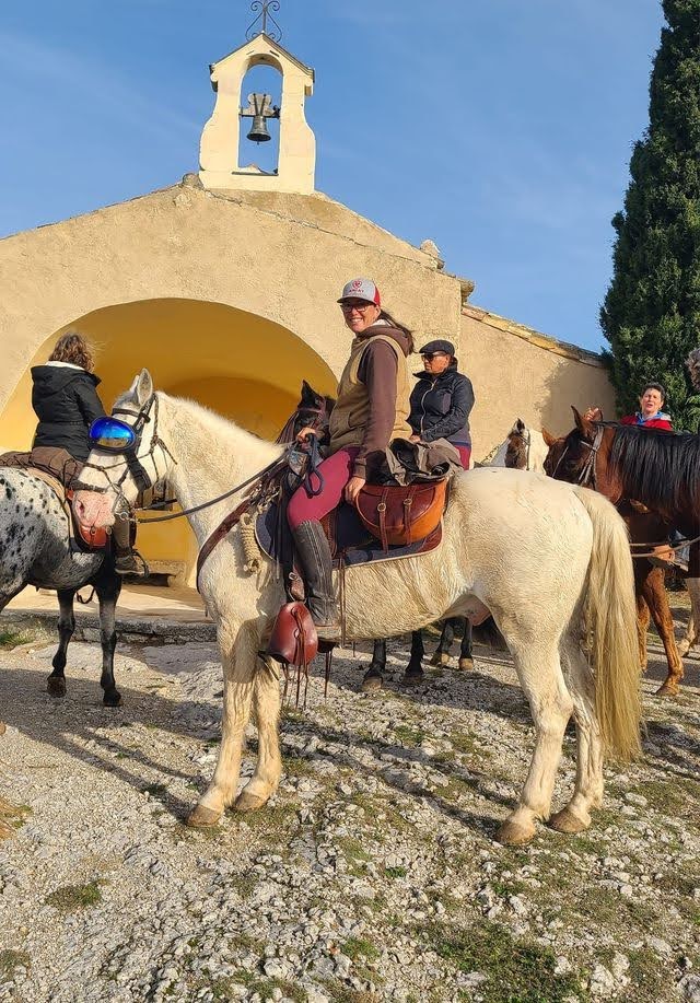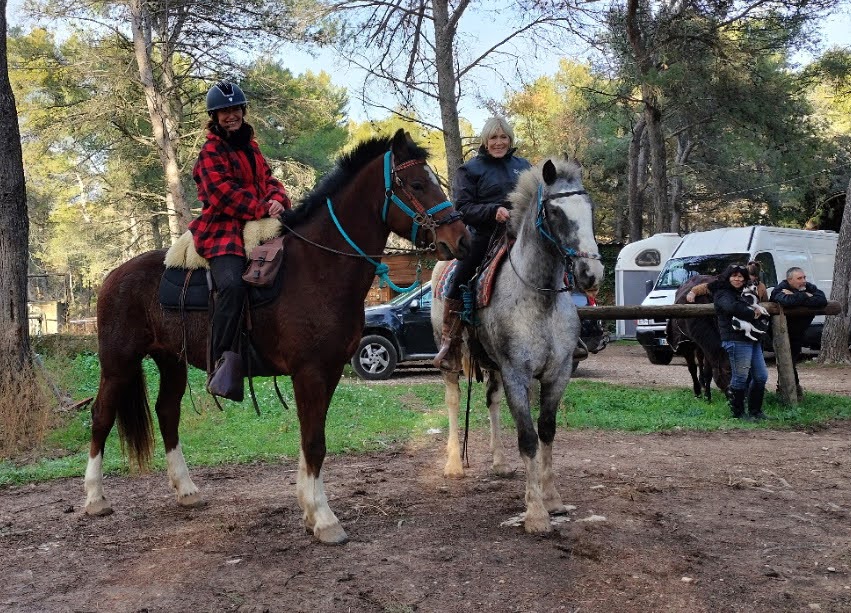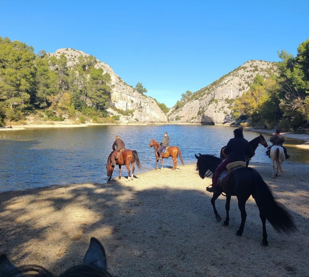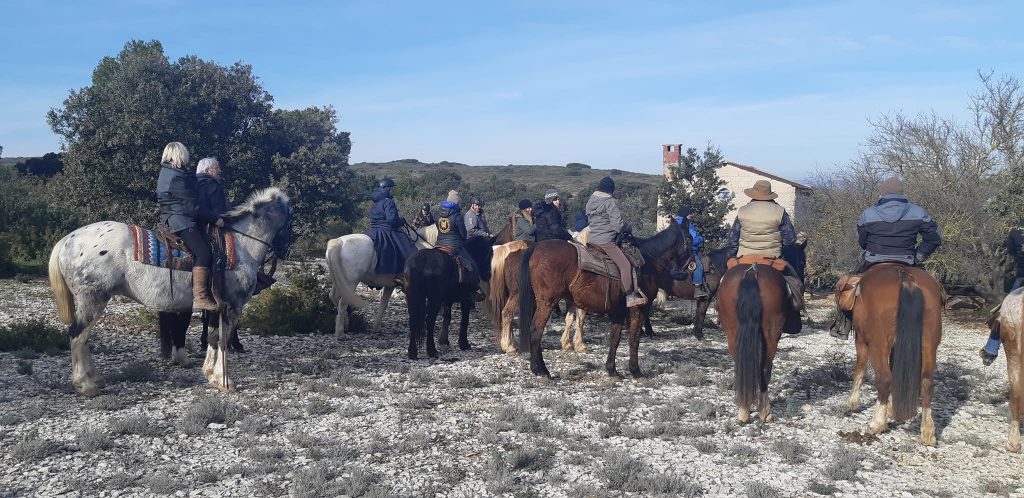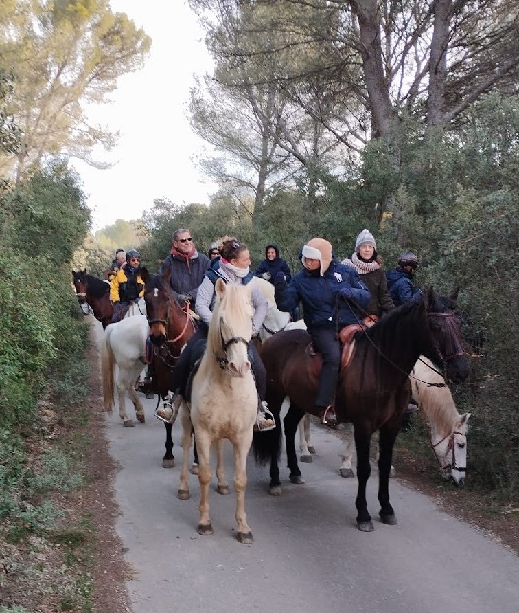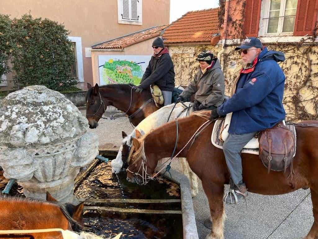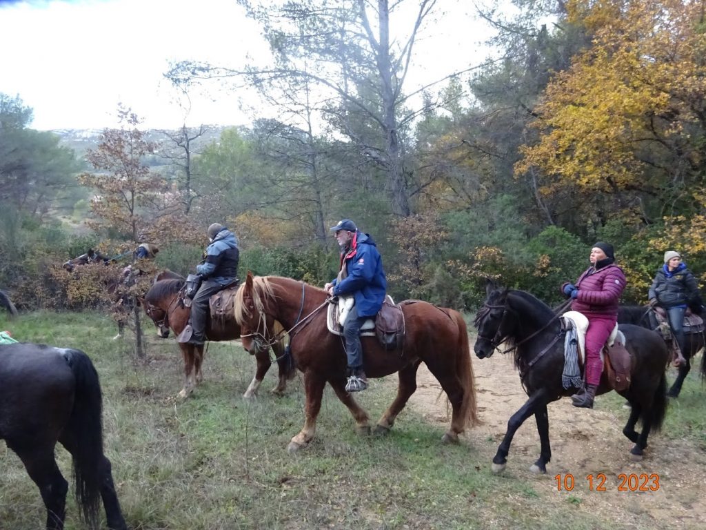 Après un pique-nique sous les rayons de soleil timide mais bien agréable en cette période hivernale, nous repartons par de jolis chemins boisés qui nous mènent au joli village de Jouques que nous traversons. A la grande fontaine qui coule en abondance, nos montures s’alignent autour pour boire, tels les chevaliers de la table ronde !